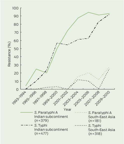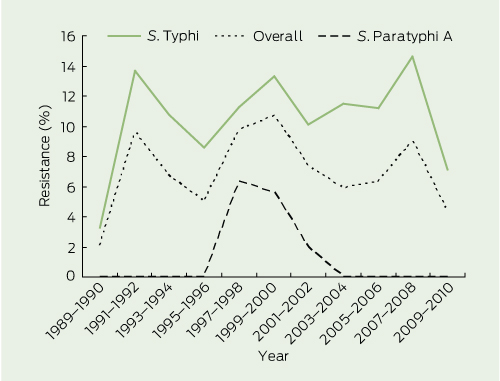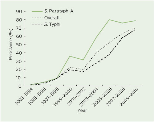 Our study details the emergence of multidrug and nalidixic acid resistance in returned travellers from Australia and others who have acquired enteric fever overseas over the past 26 years. While the rate of multidrug resistance has plateaued, the rate of nalidixic acid resistance has continued to increase in both S. Typhi and S. Paratyphi isolates. The current Australian Therapeutic guidelines: antibiotic recommend the use of ceftriaxone or azithromycin,4 either of which is effective treatment for patients with confirmed or presumptive enteric fever, including drug-resistant infection; however, those who acquire enteric fever in places such as Bali, Indonesia, could be confidently treated with ciprofloxacin due to the low rates of resistance. To ensure emerging resistance is detected and to inform treatment, it is vital that the current comprehensive testing of antibiotic resistance in enteric fever isolates continues.