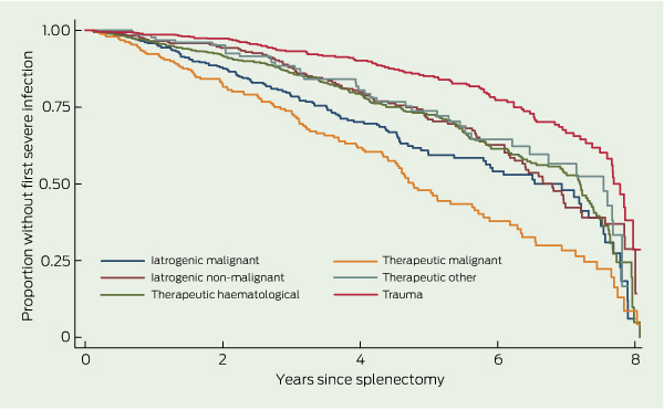 Based on one of the largest population-based cohorts of splenectomised patients in the literature, our results show that 26% of splenectomised patients had at least one severe infection requiring hospitalisation during the period of observation, with these occurring at a mean of 3.5 years after splenectomy. Our rate of postsplenectomy infection of 8.0 per 100 person years is consistent with international studies (using the same case-definition for severe infection), which have reported rates of 7.0,8 7.2,9 and 7.710 per 100 person-years. A Western Australian study reported a substantially lower rate of severe infection of 0.4 per 100 person-years, but included only septicaemia, meningitis and pneumococcal pneumonia.11 In contrast, a Danish civil registry system reported a risk of severe infection in the community of 2.0 per 100 person-years.10