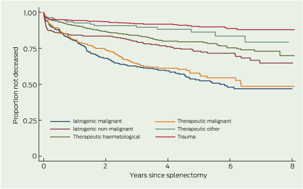 The rates of infection were lowest among patients splenectomised for trauma and highest among those splenectomised for malignant disease, in keeping with other literature.8,9,12,13 Notably, trauma patients may have a partial protective effect from splenosis, owing to self-implanted remnants of the traumatised spleen.18 Partly because of the problems associated with using an administrative dataset, it is difficult to determine whether infection or death was due to the splenectomised state or to the intrinsic risk conferred by the underlying disease process as well as immunosuppressive therapies. This represents an important limitation of our study.