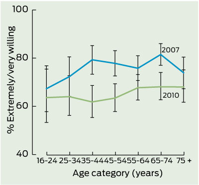 Results: In 2007, 14.9% of the general population considered that an influenza pandemic would be highly likely to occur in future; this proportion rose to 42.8% in 2010 (odds ratio [OR], 4.96; 95% CI, 3.99–6.16; P < 0.001). Conversely, in the same period concern that respondents or their families would be directly affected by a future pandemic dropped from 45.5% to 32.5% (OR, 0.57; 95% CI, 0.44–0.74; P < 0.001). Willingness to be vaccinated against influenza in a future pandemic decreased from 75.4% to 64.6% (OR, 0.69; 95% CI, 0.55–0.86; P < 0.001). A general decrease in willingness to be vaccinated was noted across all age groups, most notably for those aged 35–44 years.