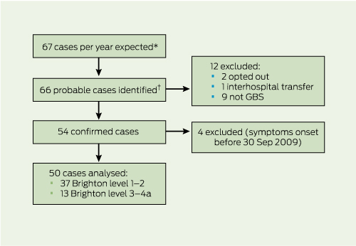 Design, setting and participants: Active GBS surveillance (cases assessed by two neurologists according to the Brighton criteria) from 30 September 2009 to 30 September 2010, conducted at 10 hospitals in Victoria, Australia.