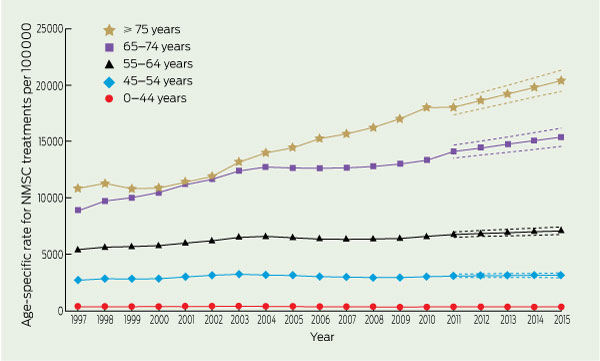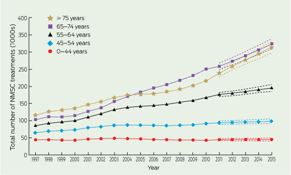 The increase in NMSC treatments could be explained in part by population growth; from 1997 to 2015 the number of people aged 65–74 years will increase by around 57% and the number of people ≥ 75 years by 68%,6 compared with the predicted increase in NMSC treatments in these age groups of 171% and 215%, respectively. In contrast, the 3% increase in NMSC treatments between 1997 and 2015 among people aged less than 45 years coincides with a predicted 15% increase in this population,6 indicating a relative decrease in the number of treatments for this age group.