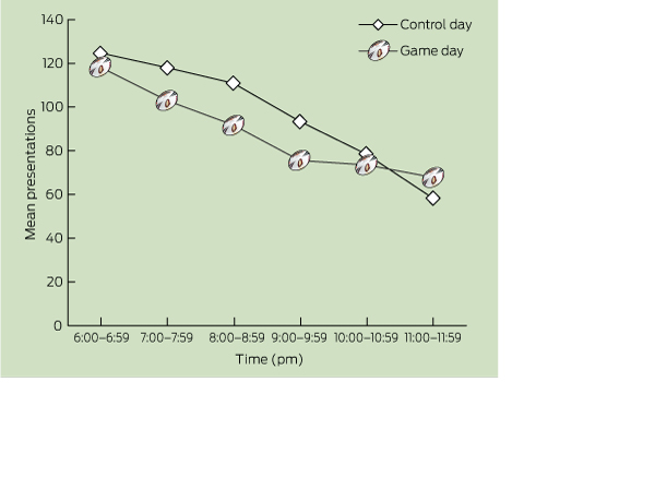Results: Proportionally, a binomial test indicated there were significantly fewer ED presentations on game days (49 702) than on control days (172 351) (P < 0.001). On average, there were 2154 presentations per day on control days and 2071 on game days, representing a 4% reduction on game days.