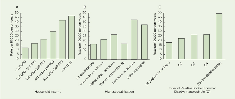 Results: Over 111 757 person-years (py) of follow-up, 312 participants had bariatric surgery, a rate of 27.92 per 10 000 py (95% CI, 24.91–31.19). Rates were highest in women, those living in major cities and those with diabetes, and increased significantly with a higher BMI and number of chronic health conditions. Adjusted RRs were 5.27 (95% CI, 3.18–8.73) for those with annual household income ≥ $70 000 versus those with household income < $20 000, and 4.01 (95% CI, 2.41–6.67) for those living in areas in the least disadvantaged quintile versus those in the most disadvantaged quintile. Having versus not having private health insurance (age- and sex-adjusted RR, 9.25; 95% CI, 5.70–15.00) partially explained the observed inequalities.