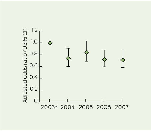 There were 1328 inhospital deaths (overall mortality rate, 13.6%; range, 15% in 2002 to 12.9% in 2007). Year of injury, level of trauma centre, ISS, body region (Abbreviated Injury Scale) and age were independent predictors of mortality (Box 3). There was a significant decrease in the unadjusted mortality and the number of patients dying at Level I centres over time (P = 0.02). The adjusted relative odds of mortality decreased significantly from 2003 to 2007, except in 2005 (Box 4). The relative odds of mortality were significantly higher among patients receiving definitive care at regional trauma centres (OR, 1.34; 95% CI, 1.10–1.63) compared with Level I centres.