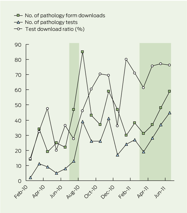Between February 2010 and June 2011, there were 675 pathology form downloads and 377 pathology tests performed. While the frequency of pathology form downloads tended to increase with time, the effect was not statistically significant (monthly percentage change, 3.5%; 95% CI, −0.8% to 8.0%); however, the number of pathology tests increased significantly (monthly percentage change, 9.5%; 95% CI, 4.3%–14.9%) (Box 2). Fifty-six per cent (n = 377) of downloaded pathology forms resulted in a test, and this proportion increased over time (χ2 test for trend, 67.81; P < 0.001).