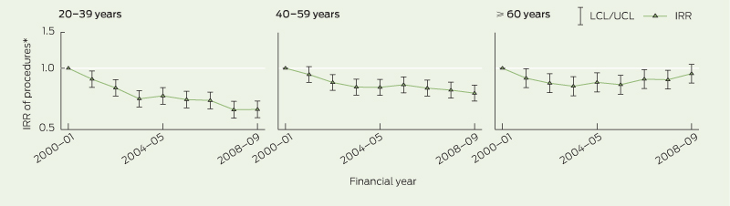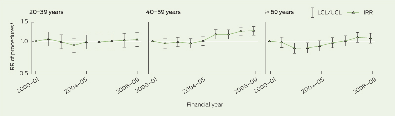 A major strength of our study is that it included all public and private hospital episode data for the whole of Victoria over a 9-year period. We identified an overall decrease in arthroscopy trends from 2000–01, after adjusting for the volume of elective orthopaedic surgery and other confounding factors. However, this trend was not sustained for patients with OA. A potential reason for the observed overall decrease in arthroscopies may be the shift to diagnostic magnetic resonance imaging for younger people who are likely to have had an episode of trauma.21 Our findings show that the largest increase in the IRR of procedures is among same-day admissions within medium orthopaedic volume, private hospitals. These trends suggest a changing model of care for use of elective knee arthroscopy.