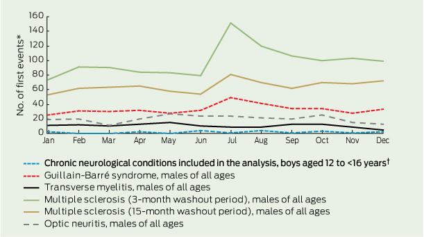 The data that we analysed comprised all episodes that occurred in boys aged 12 to < 16 years and were recorded in the VAED and/or VEMD with one of the ICD-10-AM codes listed in Box 1 and an admission or presentation date from 1 July 2004 to 30 June 2009.18 Conditions selected for inclusion are rare adverse events, conditions that patients are likely to present to hospitals with after vaccination, and conditions that have previously been raised as potential sources of concern in Australia and overseas.10,19