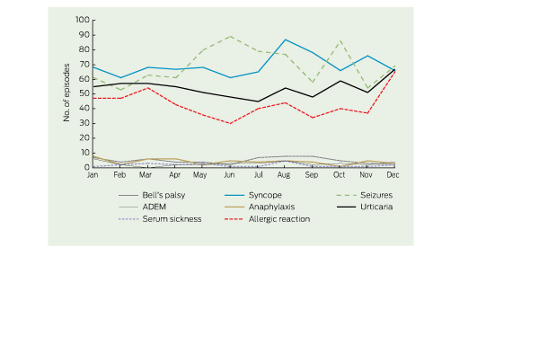 Expected rates of potential AEFI in recent studies vary widely, but direct comparisons are restricted because of differences in methods, health care systems and data collection and analyses.10,11,23 In particular, caution is required when using emergency presentation databases as these may record preliminary diagnoses, rather than final diagnoses. Studies limited to analysis of ICD-10 coded data, such as ours, lack the rigour of diagnosis verification and conformity to standardised case definitions, although coding standards are maintained. Our study identified higher reporting rates for anaphylaxis compared with similar studies.10,11 While data aberrations are possible, marked increases in anaphylaxis rates Australia and the United States over the past two decades may play a part.24,25
