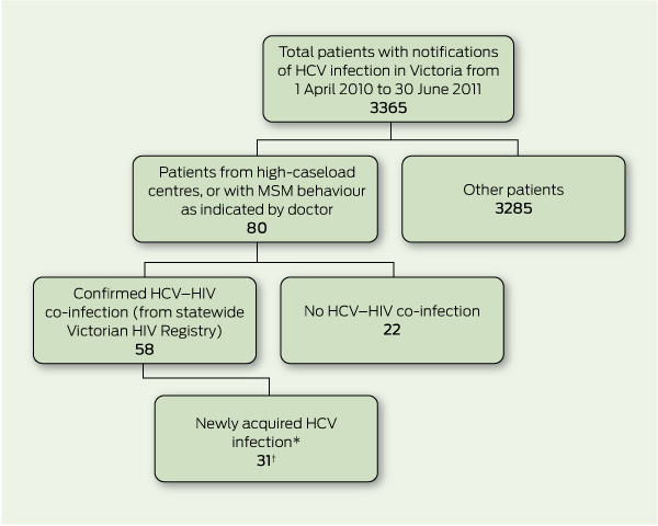 High-caseload centres were the focus of our investigation, including general practitioner clinics specialising in HIV medicine and infectious diseases services. All notifications from these centres were crosschecked with the Victorian HIV Registry (Centre for Population Health, Burnet Institute, Melbourne) to identify patients with co-infection. We undertook the same process for any doctors’ notifications where MSM behaviour was indicated. A standard definition of newly acquired HCV was used, based on any one of: antibody seroconversion in the previous 24 months, new viraemia with a negative antibody test in the previous 24 months, or unexplained alanine aminotransaminase (ALT) elevation (at least 350 U/L; reference interval, 5–50 U/L) at first positive antibody or HCV RNA detection.15