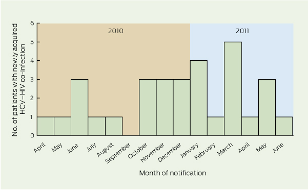 4 Distribution of cases of newly acquired hepatitis C virus (HCV) infection in HIV-infected men who have sex with men in Victoria by month of notification from 1 April 2010 to 30 June 2011