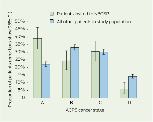 Results: Of 3481 eligible patients, 221 had been invited to the NBCSP. Invitees were more likely to have stage A lesions compared with all other patients (34.8% versus 19.2%; P < 0.001), and half as likely to have stage D CRC (5.4% versus 12.4%; P < 0.001). A further shift towards earlier stage was seen in those who participated in screening and those with positive test results compared with all other patients (38.8% stage A and 3.0% stage D in screening participants versus 19.3% stage A and 12.4% stage D in all other patients; and 39.7% stage A and 2.6% stage D in those with positive test results versus 19.3% stage A and 12.4% stage D in all other patients; P < 0.001).