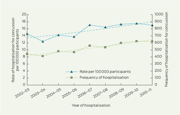 Our findings show that the number of patients with ICD-10-AM-coded sport-related concussion admitted to hospital in Victoria increased by 61% over the period 2002–03 to 2010–11. Much of this increase was independent of changes in sports participation, because the participation-adjusted hospitalisation rate also increased significantly by 39% over this period.
