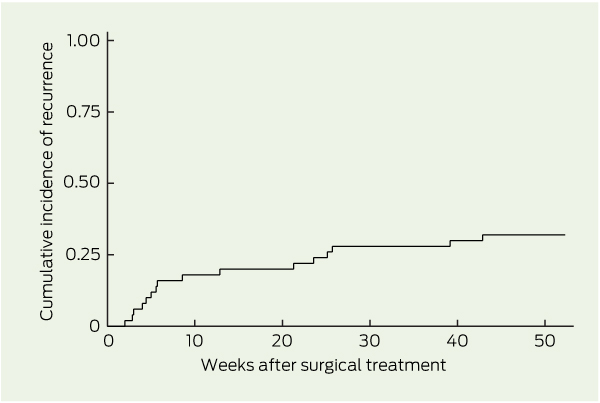 There were 20 recurrences in 16 patients. The incidence rate was 41.8 (95% CI, 25.6–68.2) per 100 person-years for first recurrences over 38.3 years’ follow-up, and 48.1 (95% CI, 31.0–74.6) per 100 person-years for all recurrences over 41.6 years’ follow-up. The Kaplan–Meier curve for cumulative incidence of first recurrences is shown in Box 2. The median time to recurrence after treatment was 50 days (IQR, 30–171 days) for first lesions and 90 days (IQR, 33–171 days) for all lesions. Recurrence involved a lesion ≤ 3 cm from the original lesion in 13 cases, and > 3 cm in nine (two patients had recurrences both ≤ 3 cm and > 3 cm from the original lesion).