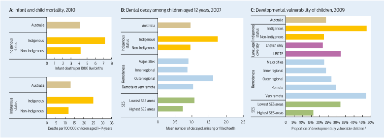 Child health indicators include mortality rates (Box, A), prevalence of chronic conditions, indicators of early development (including rates of dental decay [Box, B]), promotion of early learning (eg, adults reading to children in preschool years) and school readiness assessed with the Australian Early Development Index (Box, C).3 Risk factors for poor child health include: teenage pregnancies; smoking and alcohol exposure during pregnancy; pregnancy outcomes such as stillbirths, low birthweight and preterm births; the proportion of children aged 5–14 years who are overweight or obese; and the proportion of children aged 12–15 years who are current smokers. In addition, indicators of the level of safety and security of children — including rates of accidental injury, substantiated reports of child abuse and neglect, evidence of children as victims of violence, and indicators of homelessness and crime — further highlight how poorly Aboriginal children fare during childhood.