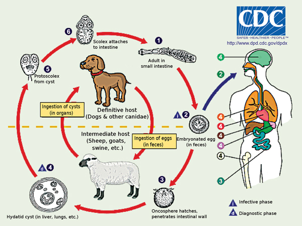 Source: DPDx Laboratory Identification of Parasites of Public Health Concern. Echinococcosis [internet image library]. Atlanta: Division of Parasitic Diseases and Malaria, Centers for Disease Control and Prevention. http://dpd.cdc.gov/dpdx/HTML/ImageLibrary/Echinococcosis_il.htm (accessed Feb 2013). The adult worm resides in the small intestine of the definitive host (1). It releases eggs into the environment (2), which are then ingested by an intermediate host. In the small intestine of the intermediate host, the oncosphere hatches, penetrates the intestinal wall (3) to enter the bloodstream, whereby it migrates and is deposited in other organs (4) and forms a cyst. The cyst produces protoscoleces (5). The cycle is complete when the intermediate host is eaten by a definitive host and ingests the protoscoleces, which go on to develop into the adult worm.