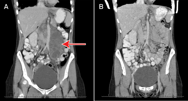 2 Abdominal computed tomography scans of Patient 1 showing (A) a baseline coronal view with a large multilobulated mass (measuring 8.3 cm × 4.3 cm axially and 17.5 cm longitudinally) in the para-aortic region (arrow), consistent with lymphangioleiomyoma; and (B) marked regression of the mass after 9 months of everolimus therapy
