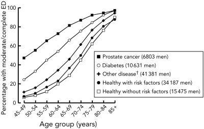 The study sample was stratified according to self-report of prostate cancer diagnoses or other diseases (Box 3). We calculated the age-related prevalence of moderate/complete ED among (i) men who reported prostate cancer, diabetes, or a disease other than diabetes; and (ii) men without those diseases (“healthy men”) but with or without lifestyle risk factors (currently smoking, body mass index [BMI] > 25 kg/m², consuming > 30 alcoholic drinks per week, being sedentary). Using unconditional logistic regression, we estimated the odds ratio (OR) and 95% CI of having moderate/complete ED for men in each of these groups compared with healthy men without risk factors, adjusting for sociodemographic characteristics.