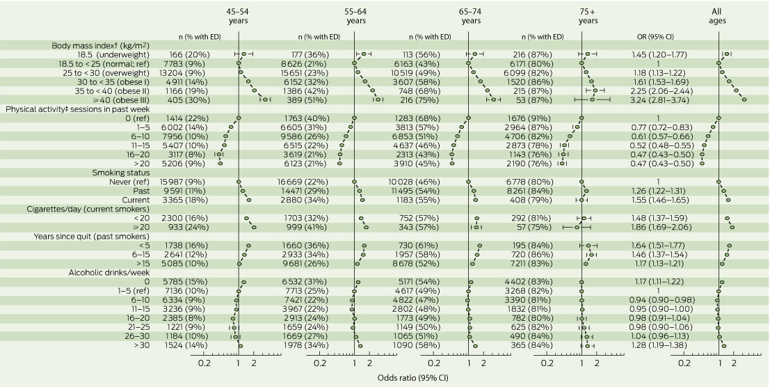 Results: In the 101 674 men reporting no prior diagnosis of prostate cancer, 39.31% (95% CI, 39.01%–39.61%) had no ED, 25.14% (95% CI, 24.87%–25.40%) had mild ED (ie, experienced ED sometimes), 18.79% (95% CI, 18.55%–19.03%) had moderate (ie, usually experienced) ED and 16.77% (95% CI, 16.55%–17.00%) had complete ED. After adjusting for sociodemographic characteristics, the odds of moderate/complete ED increased by 11.30% (OR, 1.11; 95% CI, 1.11–1.12) each year from the age of 45 years. Overall, the risk of moderate/complete ED was higher among men with low socioeconomic status, high body mass index, those who were sedentary, current smokers and those with diseases including diabetes, heart disease, and depression/anxiety, compared with men without these risk factors. Moderate alcohol consumption was associated with a significantly reduced risk of ED in men aged 45–54 years, but not in older men. Almost all men aged 75 or older reported moderate/severe ED; however, increased physical activity was associated with a lower odds of ED in this group.