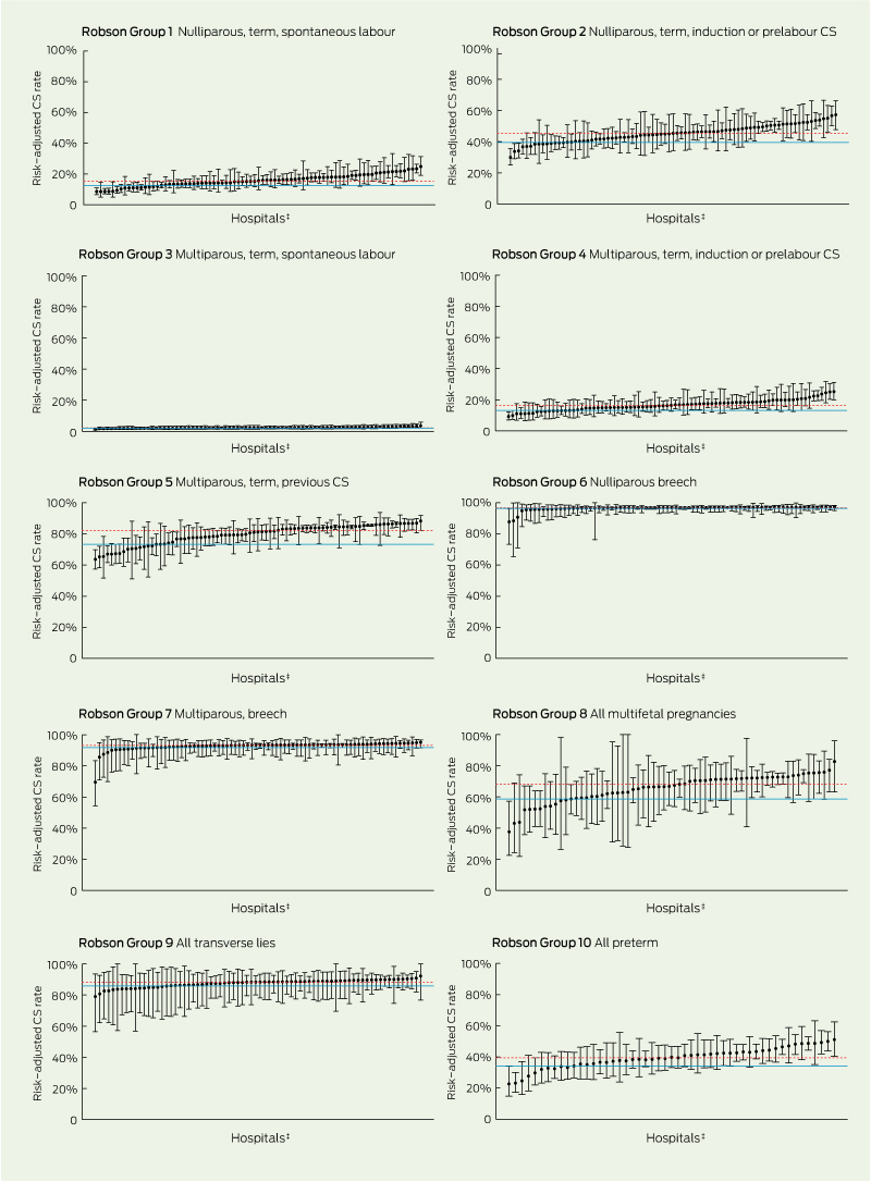 Of the 183 310 births at 81 hospitals included in our analysis, 56 696 were by CS, giving an overall CS rate of 30.9%. Hospital CS rates varied from 11.8% to 47.4% (interquartile range, 23.9%–33.1%; data not shown). Compared with women who had a vaginal birth, women who had a CS were more likely to be older, Asian-born and nulliparous. Having had a previous CS, diabetes, hypertension, private maternity care and preterm birth were also associated with an increased likelihood of CS (Box 2). The observed CS rate within the 10 Robson groups ranged from 2.3% among multiparous women with spontaneous labour at term to 96.7% births among nulliparous women with breech presentation (Box 1). The risk-adjusted hospital CS rates and their 95% confidence intervals for each Robson group are shown in Box 3.