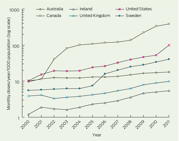 Nevertheless, despite the absence of any new approved indications, there have been major and progressive increases in testosterone prescribing in Australia over the past two decades, with striking differences between states, increasing use of costlier newer products and partially effective regulatory curbs on unproven testosterone prescribing.6,7 Anecdotally, similar increases have been described in the United States,8,9 Switzerland10 and the United Kingdom,11 but there has been no systematic study of multinational temporal trends in testosterone prescribing.
