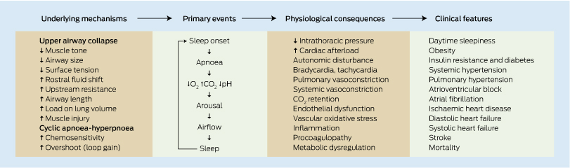 Patients with obstructive sleep apnoea (OSA) have a high prevalence of insulin resistance (IR), type 2 diabetes mellitus and cardiovascular disease (CVD), indicating a strong association among the conditions. Intermittent hypoxia with fragmentation of normal sleep contributes to significant autonomic dysfunction plus proinflammatory and procoagulopathy states,1 leading to IR and CVD (Box 1). Although obesity is a common risk factor for OSA, IR and particularly CVD, current evidence suggests that OSA itself is an independent risk factor for both IR and CVD. Clinical data suggest that this effect is most likely mediated via intermittent oxygen desaturation. However, teasing out the precise role that OSA plays in IR and CVD, independent of obesity, is difficult given the confounding effects of inactivity, sleep deprivation, diet and OSA variability in terms of age of onset, duration and severity. With this in mind, this paper attempts to review the epidemiological and interventional evidence connecting OSA with IR and CVD (Box 2).