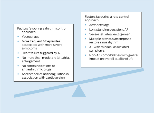 A key issue in managing AF is to decide between attempting to maintain or restore sinus rhythm or to accept AF and control the ventricular rate (Box 1). This should not be an immutable decision, as AF is a dynamic condition in which symptom status, stroke risk and even patient desires and expectations may evolve.