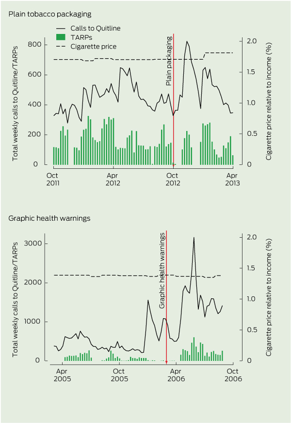 Plain packaging legislation exists to encourage smokers to quit and discourage the uptake of smoking.1 Quitline is a free resource that can be used by smokers who are motivated and seeking support to quit. Therefore, the volume of calls to cessation helplines has frequently been used as one indicator of changes in interest in quitting in response to population-wide cessation policies and programs.2-6