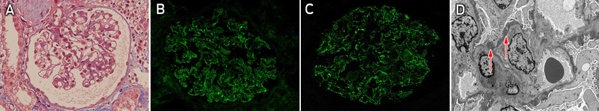 Light microscopy showed subtle glomerular changes in the biopsy specimen, including a minor increase in mesangial matrix, subtle thickening of the capillary loops, inflammatory cells in the capillary loops and a suggestion of subepithelial deposits plus background vascular changes associated with hypertension (Box 2, A). Immunofluorescence microscopy showed moderate granular staining for IgG (Box 2, B) and C1q (Box 2, C) in capillary loops but minimal staining for C3. A definitive diagnosis could not be made on the basis of these results, so the sample was analysed by electron microscopy. This revealed subepithelial deposits (Box 2, D), which, coupled with the distribution of IgG on immunofluorescence microscopy, favoured a diagnosis of membranous glomerulonephritis.