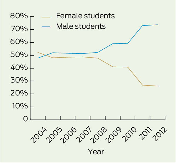 Our observations are in stark contrast to the general trend in Australia where between 2009 and 2012, 51.7% of all enrolments in Australian medical schools were female students.22 Further, using data supplied by ACER, we found no evidence of an increased proportion of males sitting the GAMSAT or applying for entry to medical school between 2007 and 2011 (Appendix 1). Indeed, among the 12 graduate-entry medical programs, between 2007 and 2011, in only two cases was the proportion of males applying higher than 50% (and the highest of these was 54.1%) (Appendix 2).