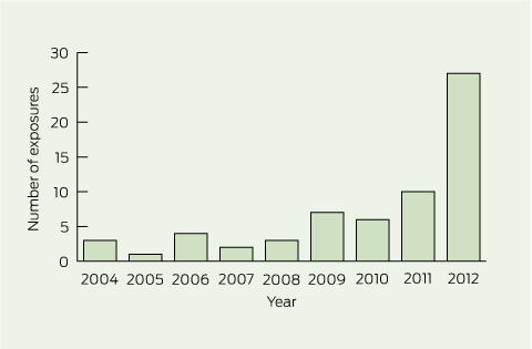 There were 63 unique episodes related to clenbuterol exposure over the 9-year study period, with a worrying increase from three episodes in 2004 to 27 episodes in 2012 and a particularly notable increase in the last year (Box 1). Most of the calls (46) were from NSW, but 17 were from interstate.