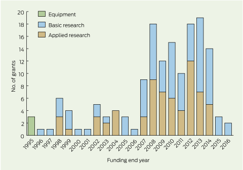 The relatively short time frame that had elapsed since many of the surveyed grants had been awarded or completed, with a demonstrable bias of returned surveys towards grants awarded in recent years, may have limited the assessment of impact, as most grants were yet to realise their promise. This was especially the case for basic research, for which downstream impacts take longer to accrue.14