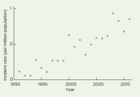 Registry data have some limitations. Some cases of LiN may have been missed, especially early in the time series, when awareness of LiN may have been low. LiN is largely a clinical diagnosis, and most patients do not undergo biopsy. LiN patients commencing RRT were less likely to undergo biopsy, and rates are decreasing compared with those for other RRT patients. Diagnostic bias is possible with any registry data. Nephrologist awareness of irreversible LiN may have increased over time, with the publication of recent epidemiological studies10 and a systematic review.7 As such, the propensity to diagnose LiN as a cause of ESRD may have increased over time. Unknown confounders may also potentially increase rates of both bipolar disorder and kidney disease. Existing data do not allow us to determine numbers of patients with ESRD associated with LiN who are not recorded in ANZDATA, because they do not receive RRT. However, most people with ESRD in Australia do commence RRT.16 Data on the number of patients receiving long-term lithium treatment in Australia are not readily available.