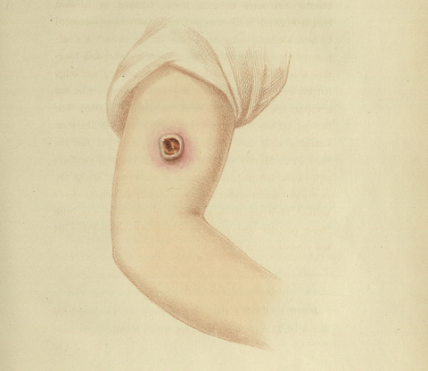 Given that vaccine scabs were frequently stored and transported, such biological material is likely to be unearthed occasionally. In 2011, a “Bizarre Bits” exhibition by the Virginia Historical Society contained a smallpox vaccine scab pinned to a letter written in 1876.24 The US Centers for Disease Control and Prevention (CDC), alerted to the potential public health risk, sent staff wearing personal protective equipment to remove the specimen, causing considerable media interest. Earlier, in 2003, an envelope labelled “scabs from vaccination of WB Yarrington’s children” was found inside an 1888 American medical book at the College of Santa Fe’s Fogelson Library.25 The librarian dispatched the envelope, unopened, to the safety of the CDC.