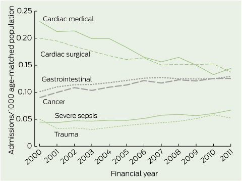 There were several important temporal trends in casemix, including increases in admissions after an emergency presentation (from 66.3% to 71.9%; P < 0.001) and in interhospital transfers (from 10.8% to 14.4%; P < 0.001). There was a substantial decline in cardiac medical and cardiac surgical admissions (P < 0.001), and a steady rise in admissions following gastrointestinal surgery, cancer and severe sepsis (P < 0.01; Box 1).