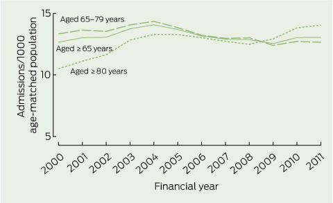 There were divergent age-related trends in ICU admission rates. In line with previous reports,2,3 the prevalence of ICU admission for very old patients has continued to rise. However, this was offset by a decline in the admission rate for those aged 65–79 years after 2004, resulting in a net decline in ICU demand by older patients (Box 3).