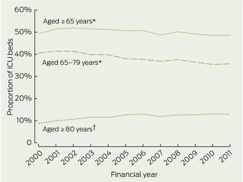 Despite a 3.1% per annum rise in ICU admissions for patients aged ≥ 80 years (from 10.5 to 14.0 admissions per 1000; Box 3), the net result was a fall in admissions for patients aged ≥ 65 years and in the proportion of ICU beds occupied by older patients, from 51.9% to 48.6% (P = 0.02; Box 4).