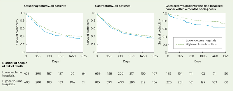 Results: Oesophagectomy (908 patients) and gastrectomy (1621 patients) were undertaken in 42 and 84 hospitals, respectively, between 2001 and 2008. Median annual hospital volume ranged from 2 to 4 for oesophagectomies and ranged from 2 to 3 for gastrectomies. Controlling for known confounders, no associations between hospital volume and > 21-day length of stay and 28-day unplanned readmission were found. Overall 30-day mortality was 4.1% and 4.4% for oesophagectomy and gastrectomy, respectively. Five-year absolute survival was significantly better for patients who underwent oesophagectomy in higher-volume hospitals (adjusted HR for lower-volume hospitals, 1.28 [95% CI, 1.10–1.49]; P = 0.002) and for those with localised gastric cancer who underwent gastrectomy in higher-volume hospitals (adjusted HR for lower-volume hospitals, 1.83 [95% CI, 1.28–2.61]; P = 0.001).