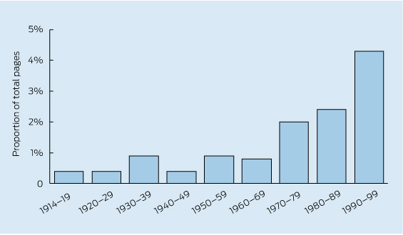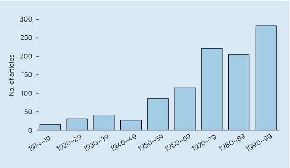 The number of Indigenous health articles dramatically increased in the MJA from the 1970s. In 1975, the Journal published its first supplement on Aboriginal health to cope with the dramatic increase in submitted manuscripts — more than 13% (95/709) of Indigenous health articles published from 1970 to 1999 appeared in supplements.7 In this time frame, an overwhelming affirmative vote in the referendum of 1967 resulted in amendments to the Australian Constitution to give the Commonwealth Government the mandate to implement policies for the benefit of Indigenous people. The Commonwealth assumed a greater role and investment in Indigenous health increased, albeit gradually.23 However, it was really not until after the National Aboriginal Health Strategy — the seminal document that set the agenda for Indigenous health — was endorsed in 1989 that the Commonwealth began to assert substantive policy authority.24