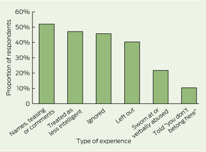 Within health settings, participants most frequently reported being a target of racist names, jokes or teasing, or hearing comments that relied on stereotypes of Aboriginal Australians. This experience was reported by 52% of respondents who reported racism in this setting. Ten per cent of respondents who reported experiencing racism in health care indicated that they had been told that they “didn't belong in Australia”, that they should “go home”, or “get out” within this setting (Box 2).