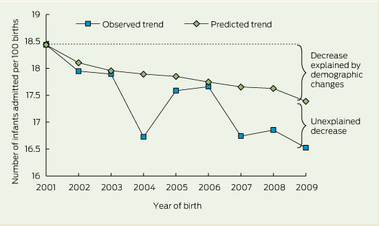 The decline in infant hospital admissions can be attributed to changes in maternal risk factors and more global policy changes, both of which can influence one another. Maternal smoking rates have been declining over the past 15 years in Australia.7 Older mothers are less likely to smoke during pregnancy, while mothers who attend antenatal care earlier in their pregnancy are more likely to stop smoking.8 Early antenatal visits were highlighted as a priority area for NSW Health policy in 2003,9 with the proportion of women attending antenatal care before 14 weeks' gestation increasing from around 62% in 2003 to almost 80% in 2010.10