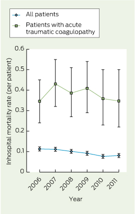 During the study period, there were 5915 major trauma presentations, of which 3147 patients (53.2%) presented after hours. Among all major trauma presentations, inhospital mortality among patients presenting after hours was 9.1% compared with a mortality of 10.1% among patients presenting at other times (P = 0.18). There were 398 patients (6.7%) who presented with ATC. Among all major trauma presentations, there was a significant trend in reduction of mortality over time (z score, − 3.44; P = 0.01), but the trend in mortality rates among patients with ATC was not statistically significant (z score, − 0.40; P = 0.69). Overall inhospital mortality rates are shown in Box 1.