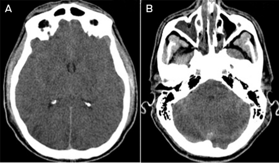 Cardiopulmonary resuscitation (CPR) was commenced by bystanders. On arrival of ambulance paramedics, the patient was confirmed to be in asystolic cardiac arrest and the paramedics continued CPR. Spontaneous circulation was restored after a further 3 minutes of advanced cardiac life support protocol. He was intubated at the scene by the paramedics. The total duration of cardiac arrest was estimated to be 16 minutes. His vital signs immediately after the arrest were: Glasgow Coma Scale (GCS) score, 3; blood pressure, 65/20 mmHg; heart rate, 85 beats/min; tympanic temperature, 39.7°C. An adrenaline infusion was started at 30 µg/min to treat persistent systemic hypotension.