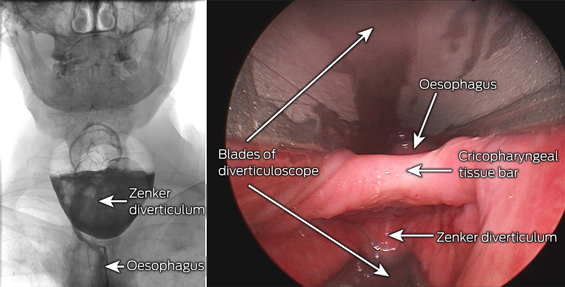 Zenker diverticula are rare, but can cause significant morbidity and mortality. A barium swallow should precede gastroscopy, as there is a risk of perforation and mediastinitis. We performed endoscopic stapling, as it is less invasive than open repair.