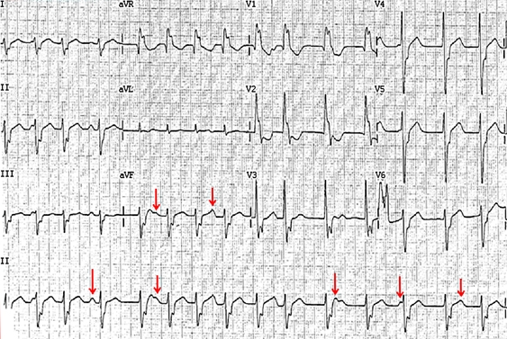 The differential diagnoses of broad complex tachycardia include ventricular tachycardia (VT), supraventricular tachycardia with aberrancy and a ventricular paced rhythm. The diagnosis of broad complex tachycardia remains challenging despite various criteria having been established to differentiate VT from supraventricular tachycardia with aberrancy.1,2 The patient's initial presenting electrocardiogram (ECG) was misdiagnosed as atrial fibrillation (AF) because of the irregularly irregular rhythm. In VT, the rhythm is usually regular or almost regular but beat-to-beat variations can occur in the presence of captured beats (when an atrial impulse causes depolarisation via the normal conduction system, resulting in a narrow QRS complex occurring earlier than expected) or fusion beats (when an appropriately timed sinus impulse fuses with the wide QRS complex from VT to produce a relatively narrowed QRS complex). In addition to an irregularly irregular rhythm, however, the diagnosis of AF requires the absence of P waves, and fibrillation of the baseline (f waves); neither feature was evident on the patient's initial ECG.