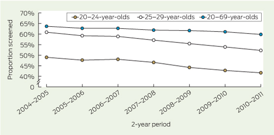 Analysis of participation trends from 2004–2005 to 2010–2011 in Victoria for women aged 20–24 and 25–29 years shows that, after a small peak in 2006–2007, coinciding with the start of the National HPV Vaccination Program, participation in cervical screening declined steadily (Box 1).1 For women aged 20–24 years, participation over the period 2006–2007 to 2010–2011 declined from 48.1% to 41.7%; for women aged 25–29 years, it declined from 58.9% to 52.3%. This trend was mirrored in national participation rates over this period.1