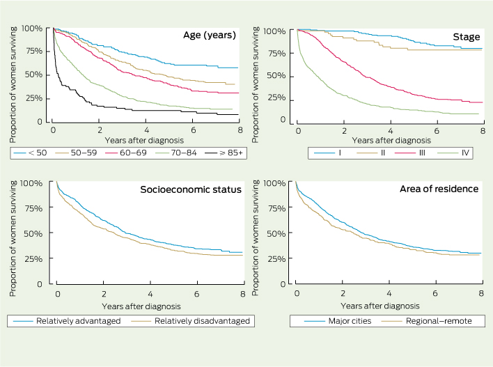 Higher comorbidity scores were modestly associated with survival, as was socioeconomic status (Box 1). Compared with women from relatively socioeconomically advantaged areas, women from relatively disadvantaged areas had a 21% higher risk of dying during follow-up. A similar difference was seen for women living in regional–remote areas versus major cities. There were no significant survival differences by state after adjustment.