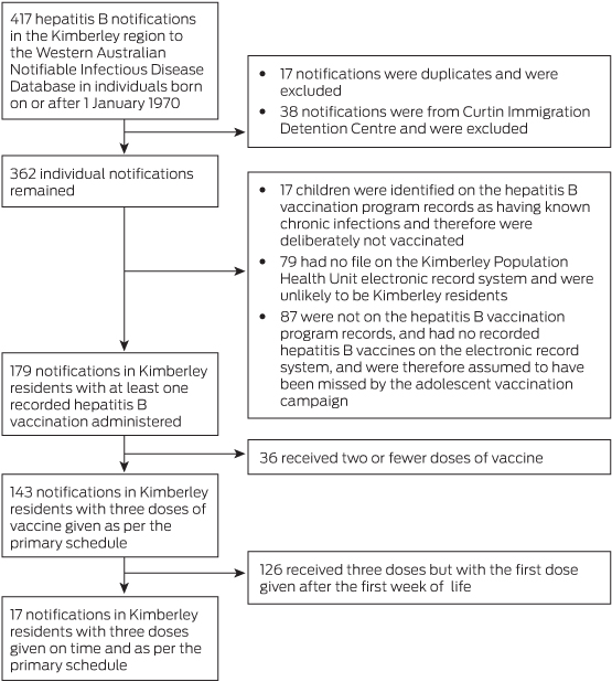 The final cohort was determined by cross-referencing this information with available immunisation history and hepatitis serology records (Box 1). Records of childhood vaccination were taken from the WA Department of Health country public hospital database (Health Care and Related Information System) and paper records held by the Kimberley Population Health Unit. Child and maternal hepatitis serology results were obtained from patient electronic records (Communicare [Communicare Systems] and MMex [University of WA]) and WA Country Health Service paper file reviews.