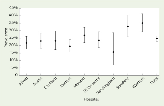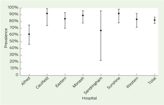 Hospital data are shown separately except for Eastern Health which includes Box Hill, Maroondah and Angliss Hospitals. Ten of Melbourne's 19 adult general hospitals participated, including four of five major tertiary teaching hospitals (The Alfred, Austin, Monash and St Vincent's) as well as six other teaching and community hospitals (Eastern, Sandringham, Sunshine and Western). One of eight rehabilitation hospitals also participated (Caulfield).