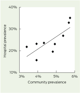 The prevalence of diagnosed diabetes in the Victorian community is 5.1% as assessed by National Diabetes Supply Scheme (NDSS) registration,9 although this is an underestimate that excludes unregistered and undiagnosed patients. Rates within the Melbourne metropolitan area range from 2.4% in the Inner Melbourne local government area to 6.7% in Brimbank (centred on Sunshine) and Greater Dandenong. Diabetes prevalence was calculated in the four local government areas nearest each hospital. Assuming these account for most admissions, there was a strong correlation between inpatient and community prevalence of diabetes (r2 = 0.60, P = 0.01) (Box 3). Even assuming that 50% of diabetes in the community is undiagnosed,1 these figures suggest a threefold increased hospitalisation risk with diabetes. Factors accounting for the remaining variance between hospitals may include differences in education, social class, ethnicity, provision of community diabetes support services and inpatient services available in each hospital.